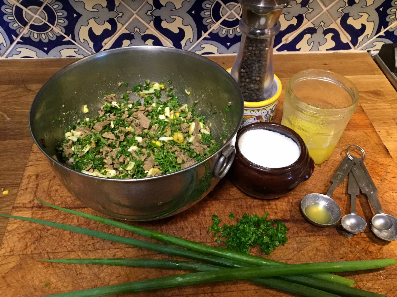 - Chop the liver and eggs and add to a mixing bowl along with the parsley, onion, salt and pepper.