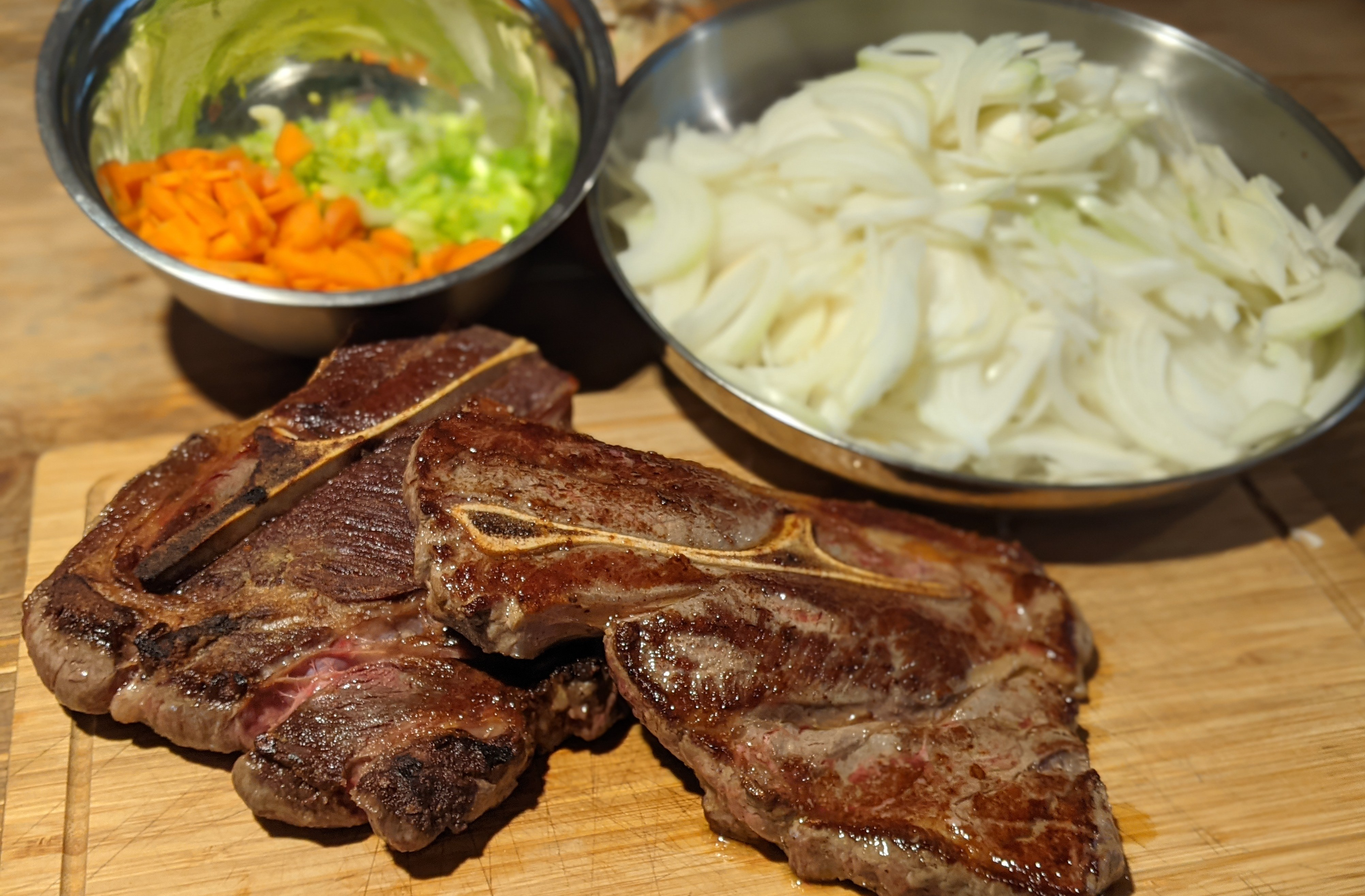Once defrosted – liberally salt meat on all sides: salting the meat in advance like this leads to a more flavourful taste experience. I do this with any meat anytime I am smart enough to remember to do it in advance. Kosher salt is best, but if you only have table salt just be careful not to over-salt.