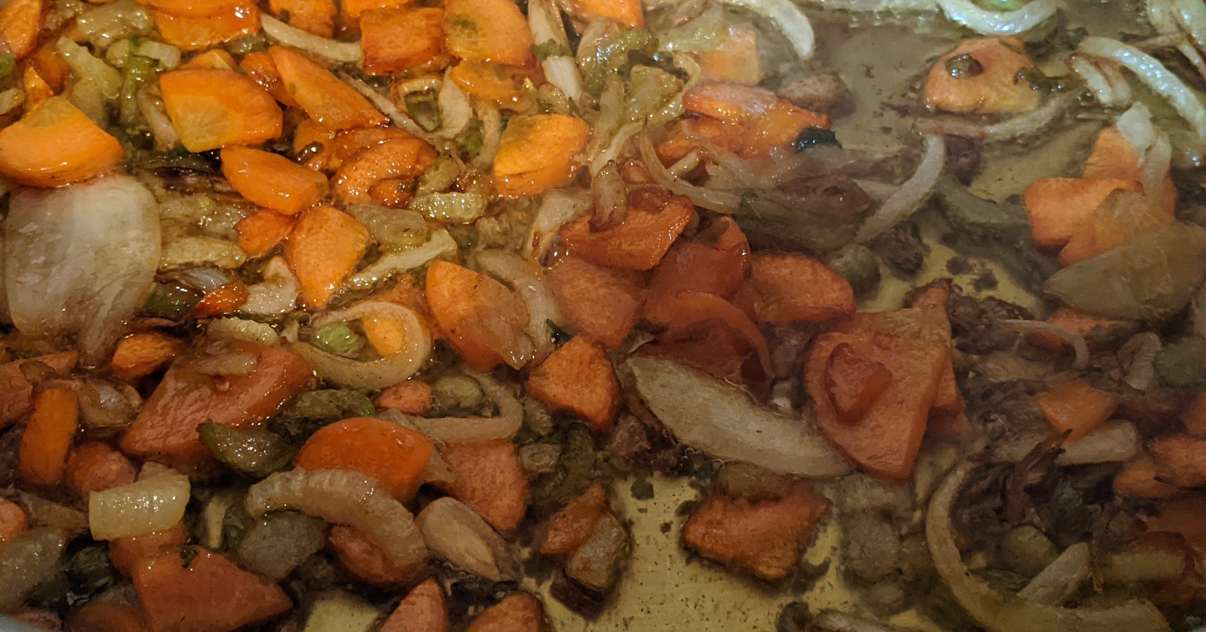 - Add the carrots, celery and a handful of onions to the pan. Caramelise for 10 minutes, stirring occasionally.
