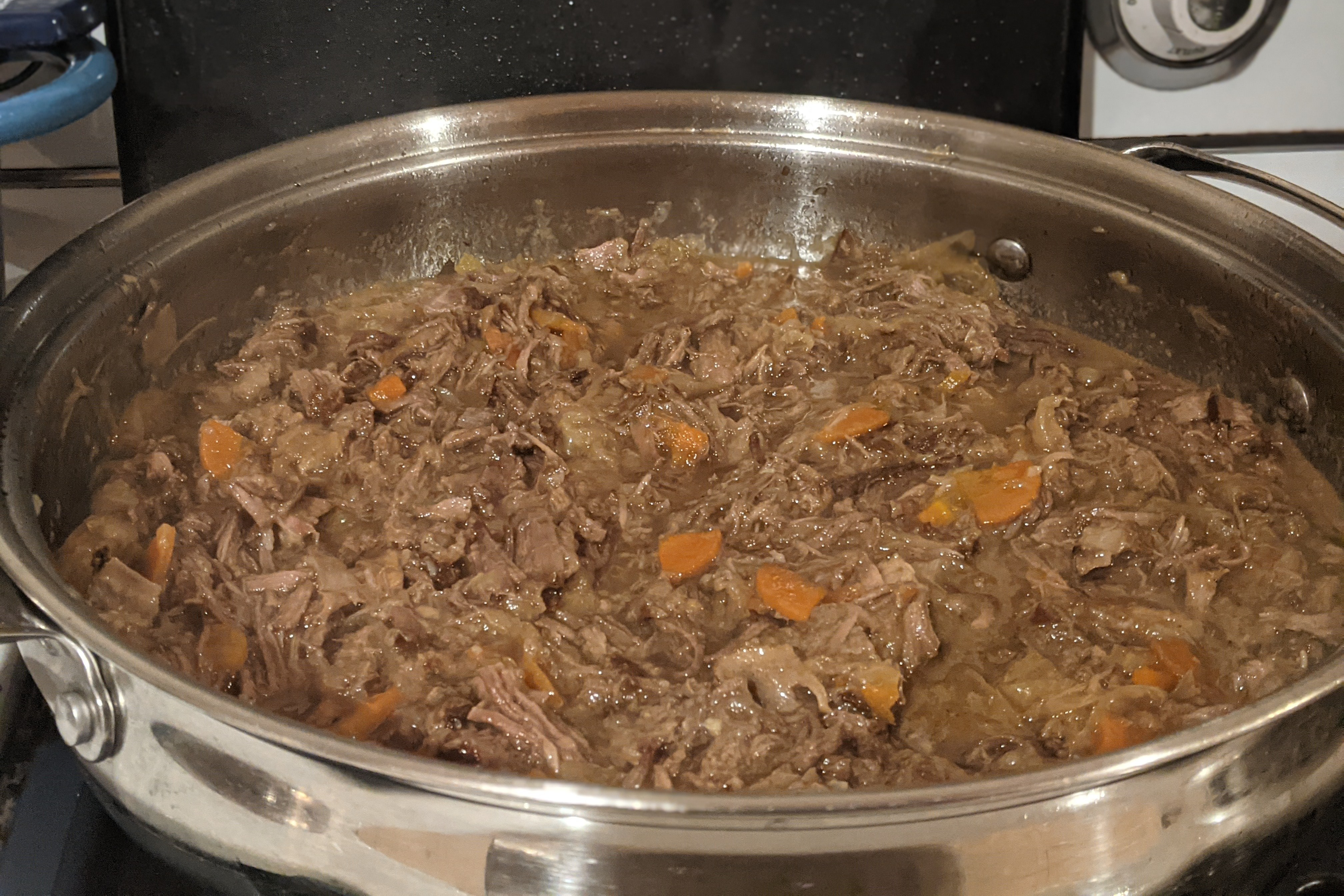 - Remove the meat from the sauce and shred, discarding bones and any gristle that did not breakdown after cooking. Add the meat back into sauce, season with salt and pepper, and carefully add nutmeg by the pinch to taste.