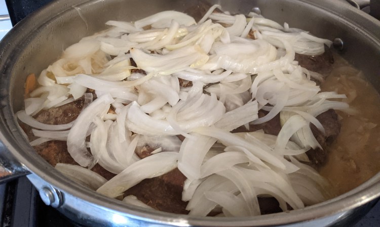 - Reduce the heat to low- add half the onions, layer in the meat, cover with the remaining onions add 1 cup of wine. Cover with a lid.