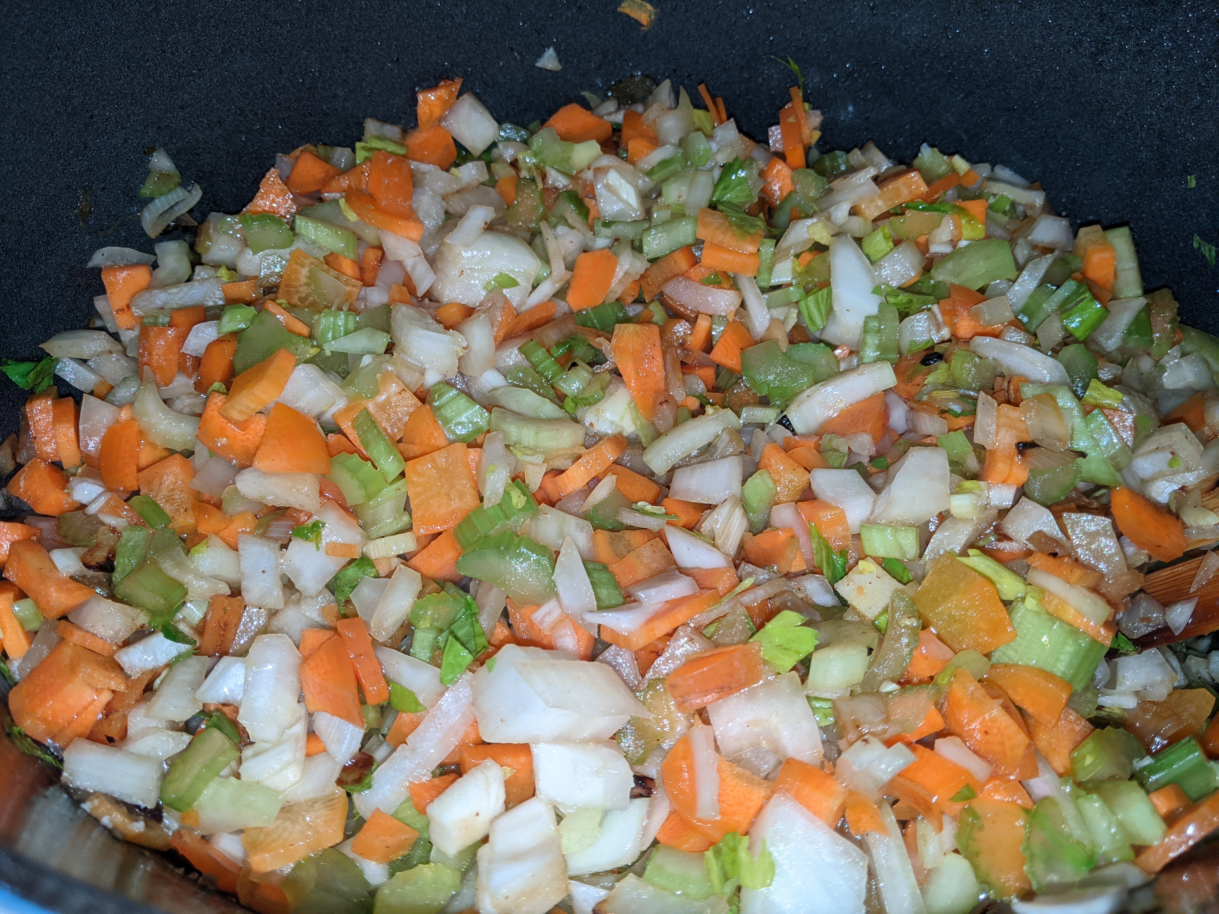 - Add more oil to the pan if necessary, and add carrots, celery, and onions. Cook down/brown till reduced by at least half in size – around 20 – 30 mins.