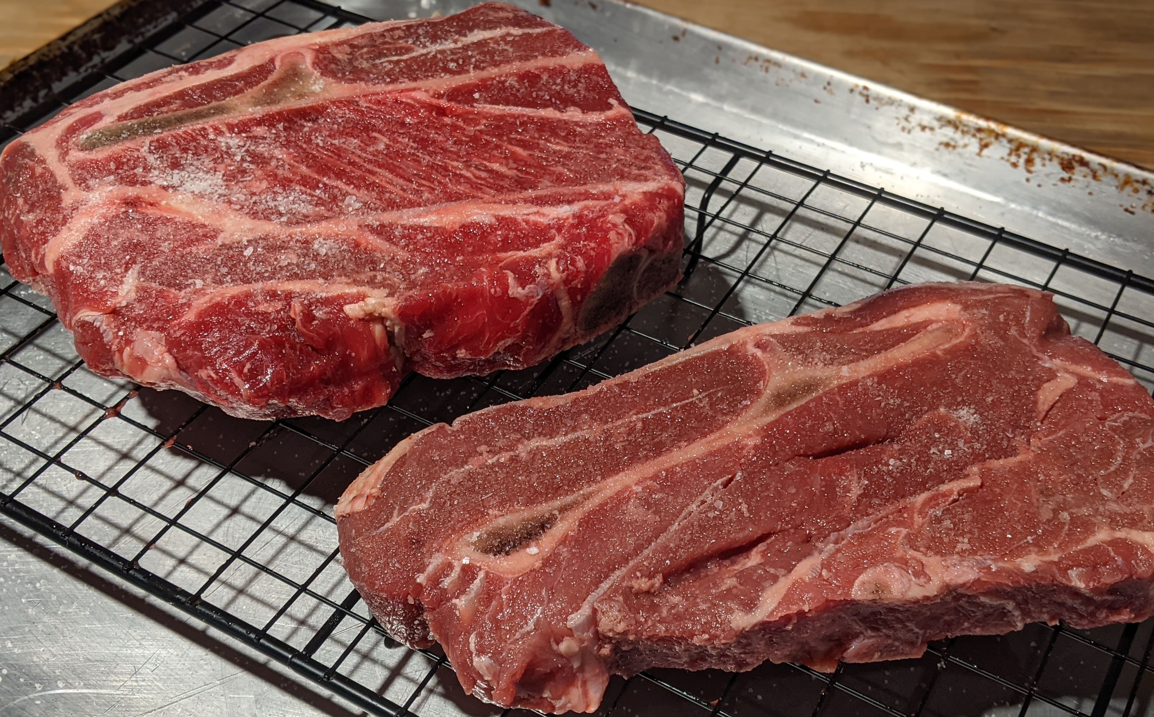 Two days Before you want to eat – defrost the steaks. A cooling rack on top of a cookie sheet works perfectly, but a plate is fine too, just remember to flip the meat a few times.