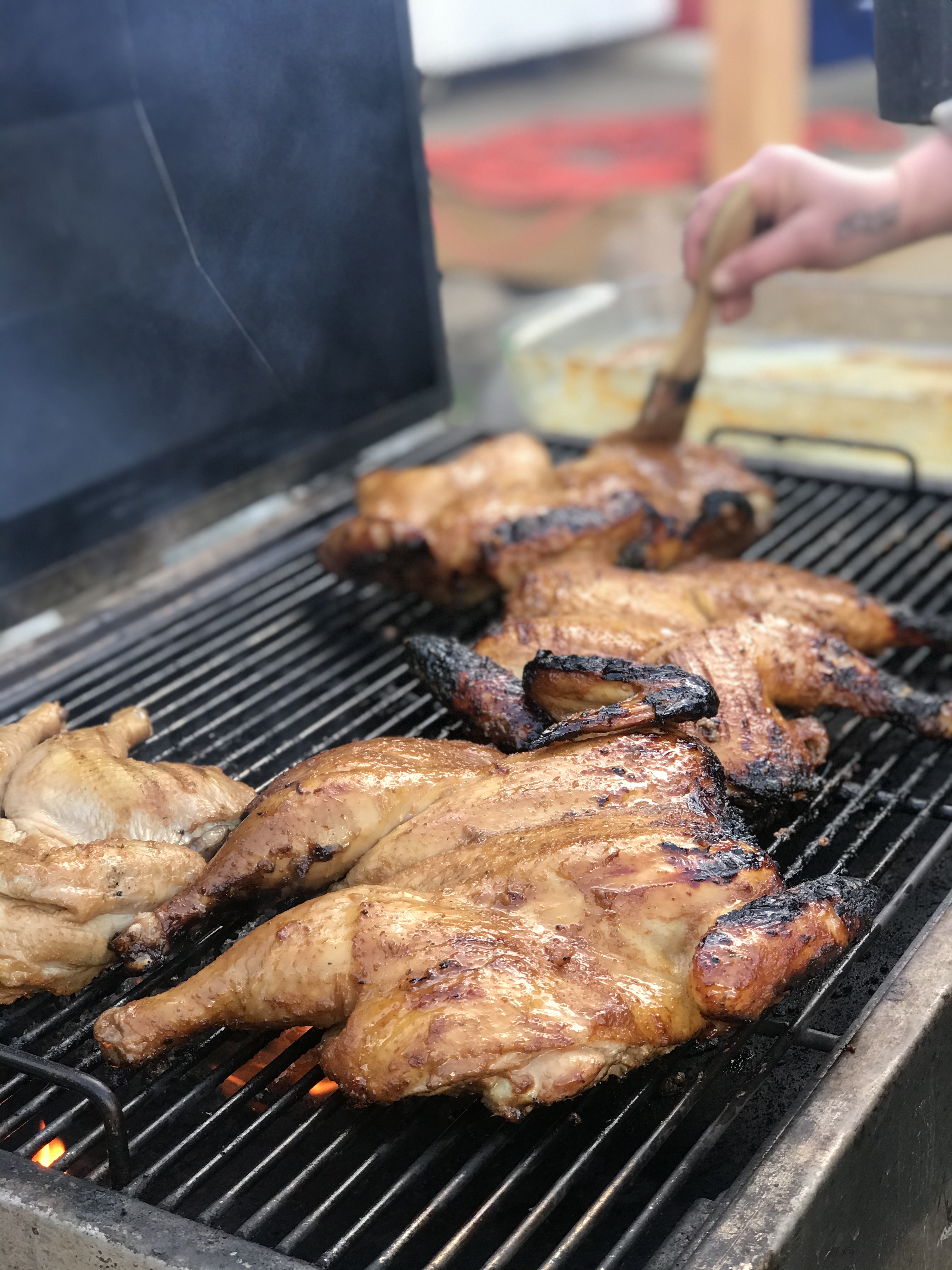 - Flip the chickens every 5-10 minutes depending on the size and heat of your grill, and use a brush or spoon to baste with the marinade every time you flip.