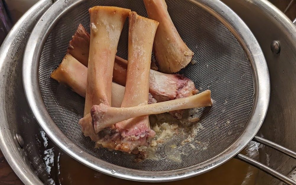 - When the pork is ready to shred, pour the stock through a strainer, holding back the solids in the pot you used for cooking.