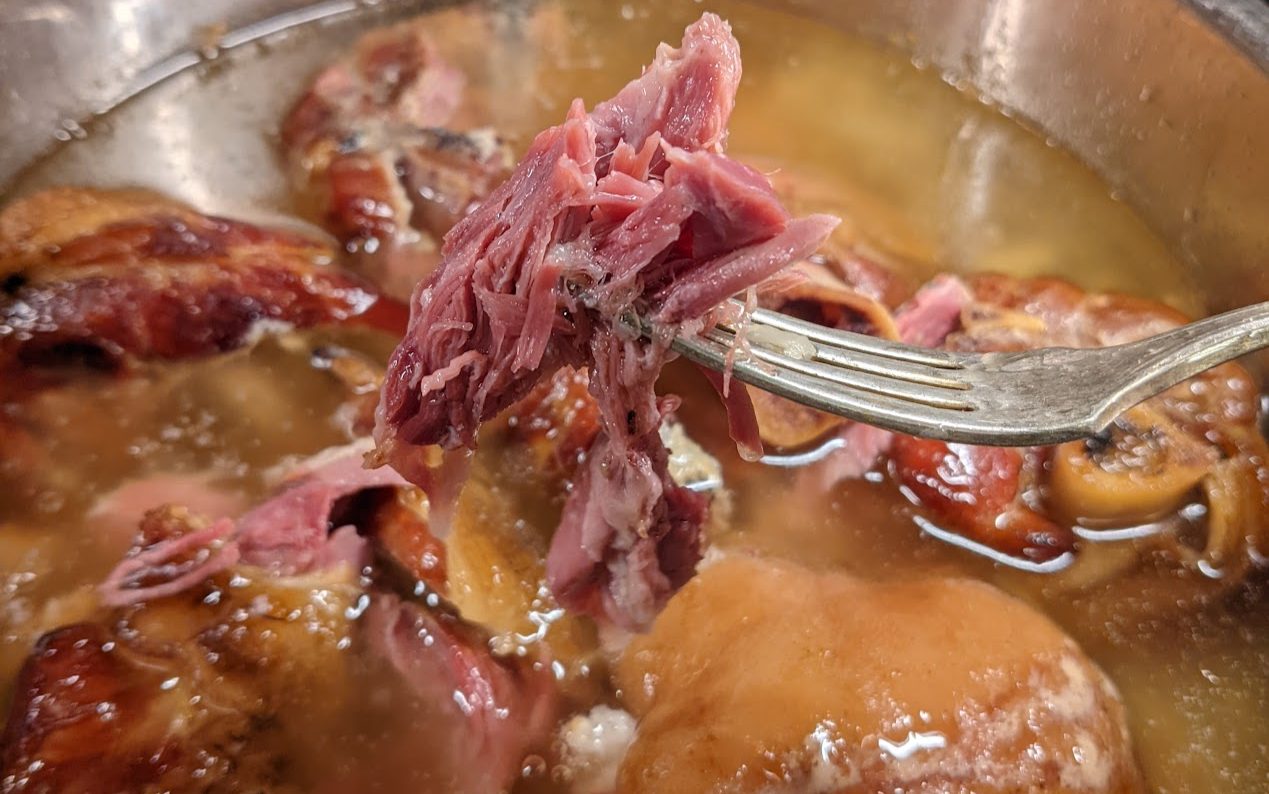 Note about instant pot vs. slow-cooker or stovetop or oven: The cooking method here is not particular, all you need to do is simmer the hocks until they fall apart – use whatever method works for you in your kitchen. I was experimenting, so I pressure-cooked mine in the Instant Pot on low pressure for 30 minutes, and then slow-cooked (still in the Instant Pot) another few hours until I got the results I wanted. The nice thing about the instant pot is it doesn’t allow any water to evaporate – if you are using a regular pot, make sure it has a tight-fitting lid, stir occasionally, and add liquid if needed.