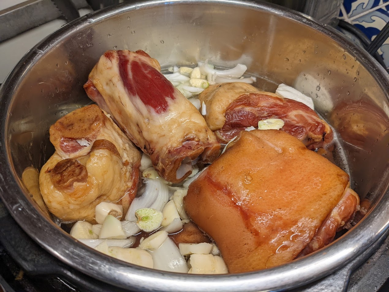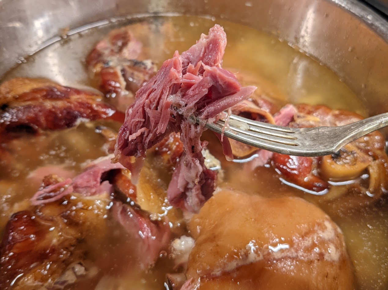 Note about instant pot vs. slow-cooker or stovetop or oven: The cooking method here is not particular, all you need to do is simmer the hocks until they fall apart – use whatever method works for you in your kitchen. I was experimenting, so I pressure-cooked mine in the Instant Pot on low pressure for 30 minutes, and then slow-cooked (still in the Instant Pot) another few hours until I got the results I wanted. The nice thing about the instant pot is it doesn’t allow any water to evaporate – if you are using a regular pot, make sure it has a tight-fitting lid, stir occasionally, and add liquid if needed.