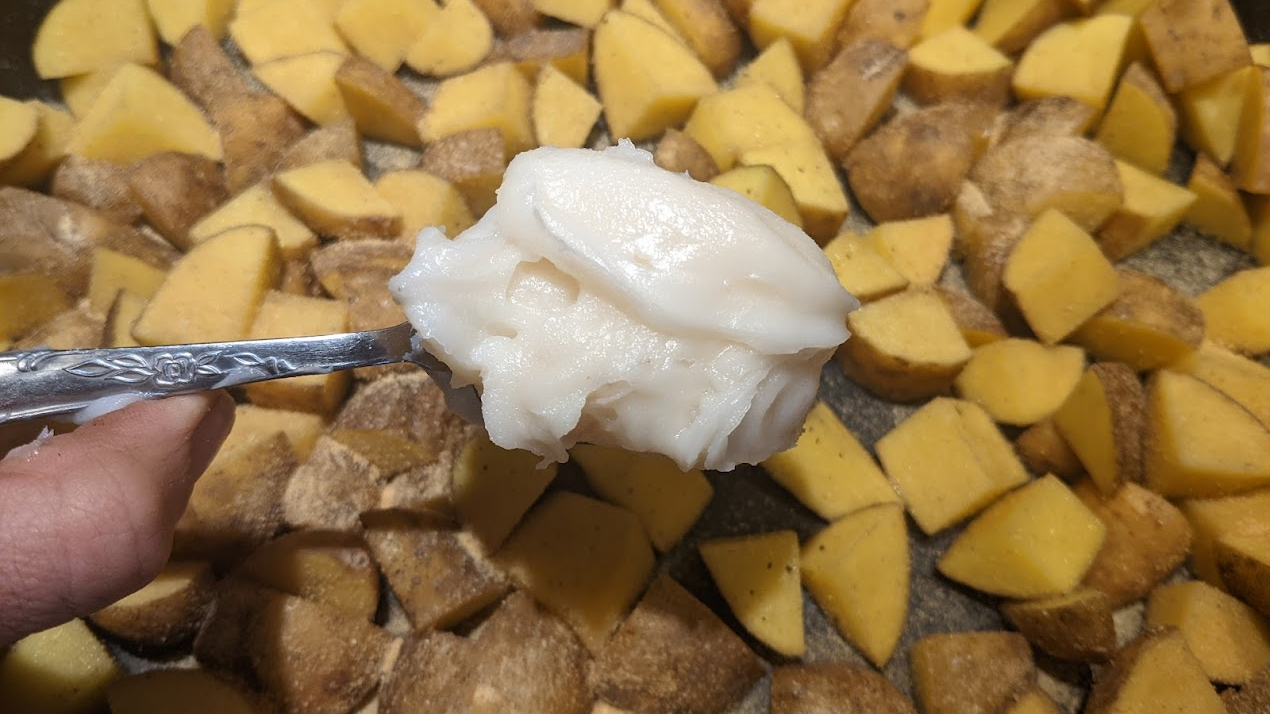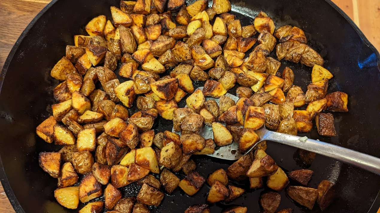 - Chop potatoes into 1″ cubes and spread on a roasting pan or large cast-iron pan (my preference!). The pieces can be touching and even overlapping a bit, as they will shrink while they bake, but use a pan(s) that allow enough room for a single layer of potatoes.