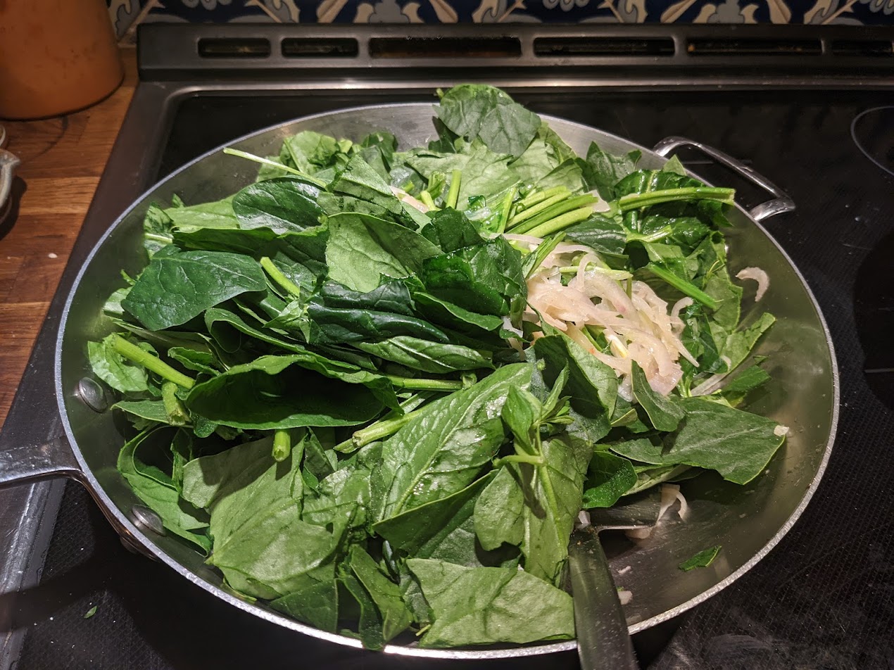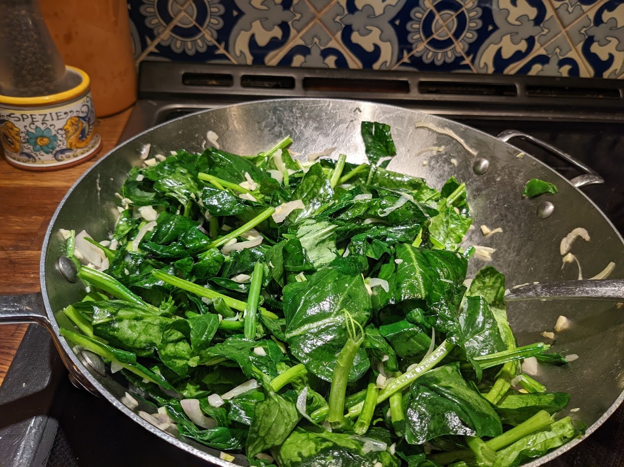- Add the spinach in big handfuls, stirring after each one. Cook until all of the spinach is wilted, about 3 to 5 minutes.
