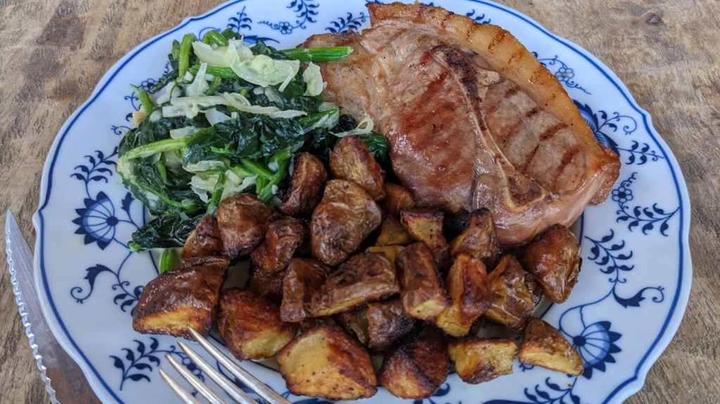How about barbecued pork shoulder steaks with sides of perfectly roasted lard potatoes and creamed spinach? A meal simple enough to cook any night, but delicious enough for a holiday feast.