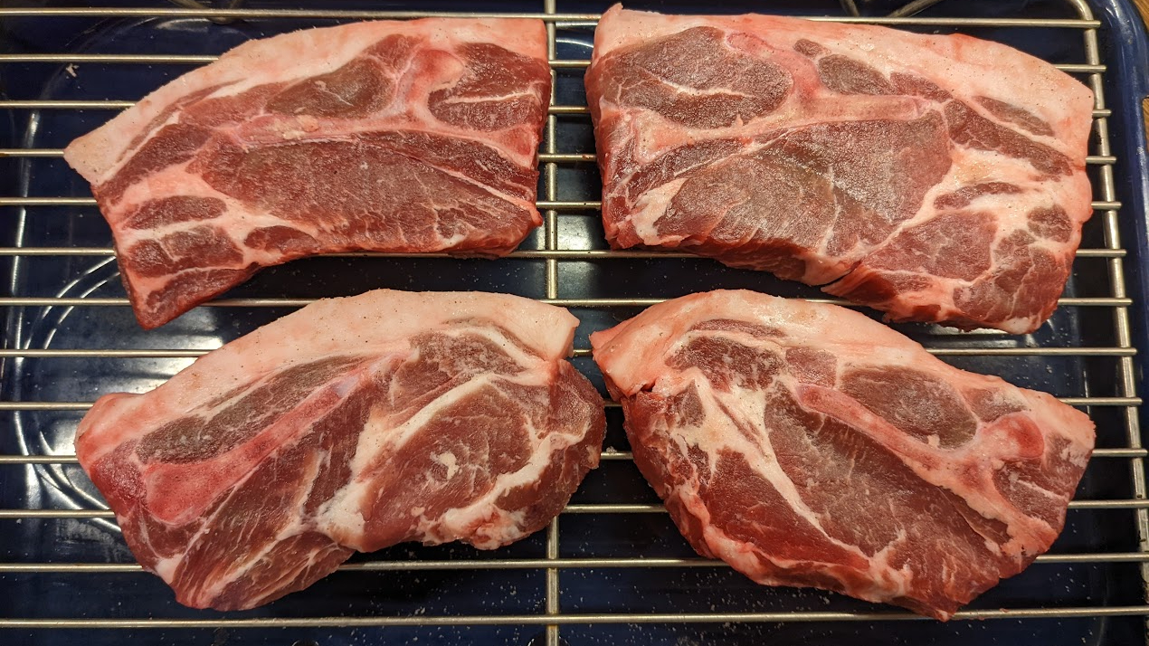 - The morning before you are going to barbeque, or at least a couple hours before, salt the thawed steaks generously and leave them on the counter, ideally on a rack. This will allow the salt to penetrate, and the meat to dry and come to room temperature.