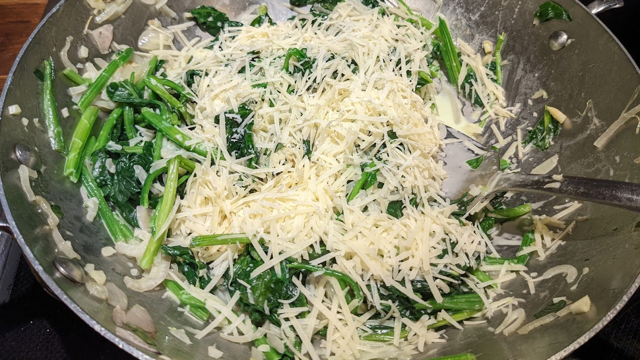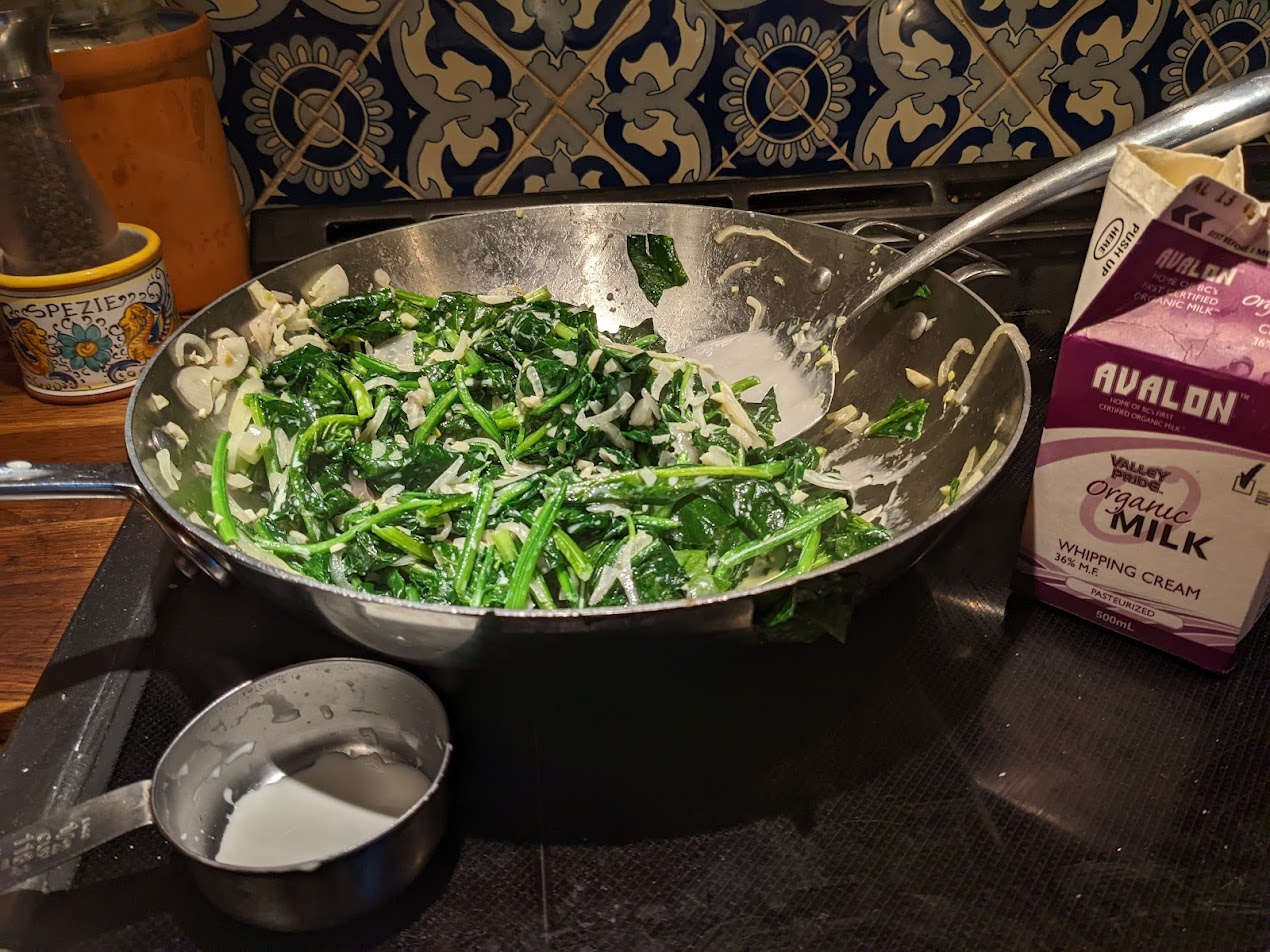 - Add the cream. Continue cooking and stirring until the spinach is totally wilted and coated in the cream. Add the Parmesan and stir to combine.