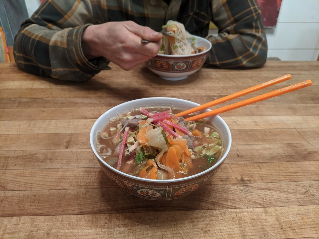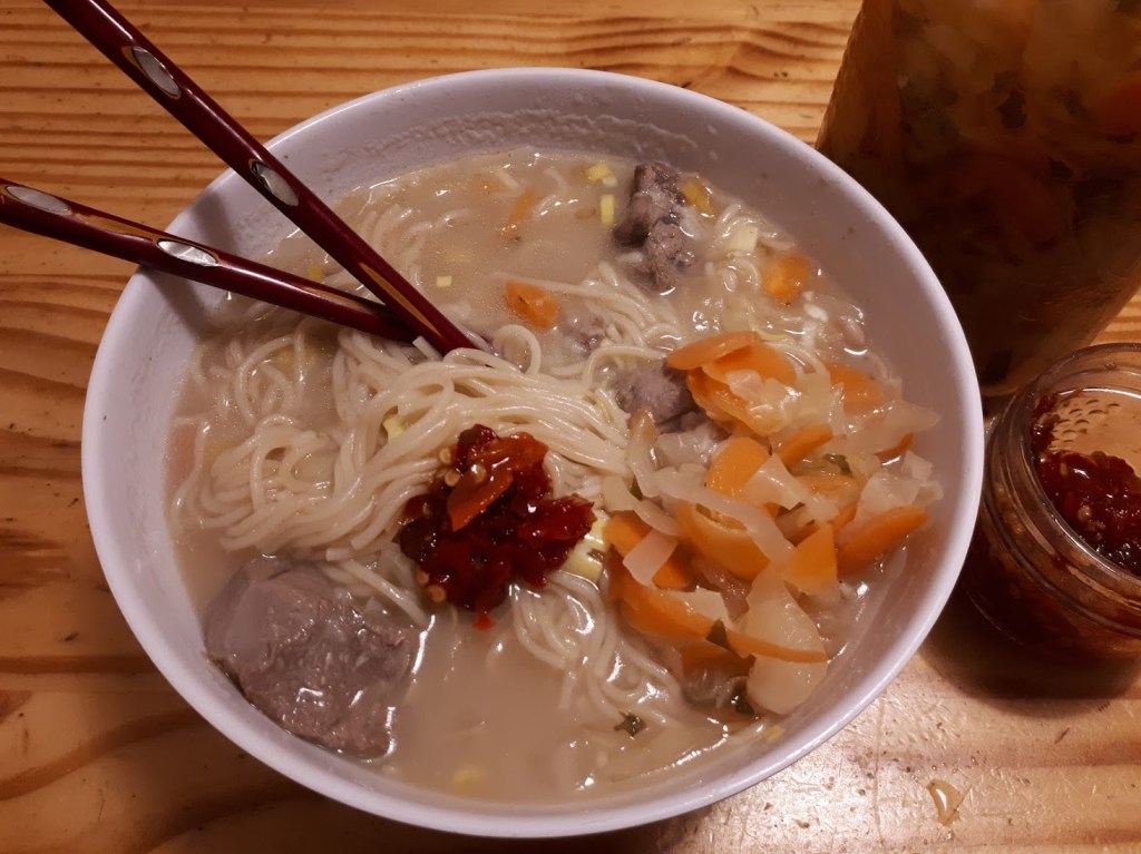 - If you like veggies, thinly slice some cabbage, radishes or carrots and add to the broth to soften. These days I usually keep it simple and just add home-sprouted mung beans.