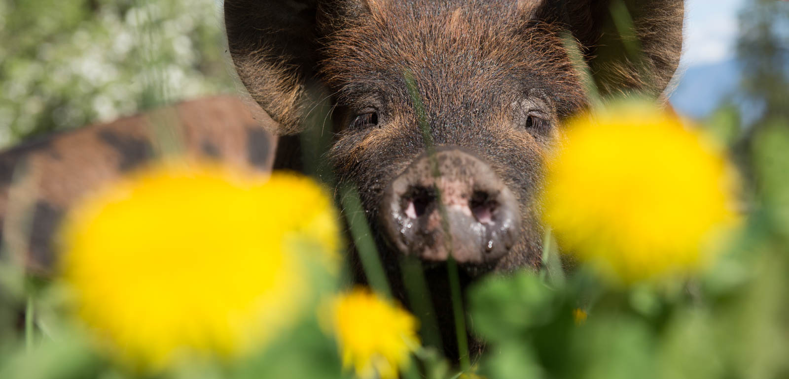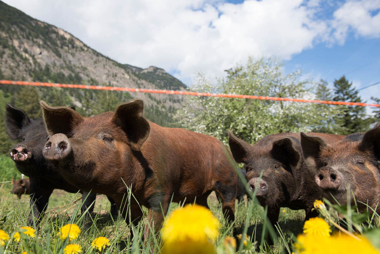 Our pigs are certified organic and raised outdoors beginning when they are only weeks old. We rotate them quickly around the farm using portable electric fencing, controlling their impact and ensuring that they always have access to fresh pasture. It’s important to us that our pigs are able to fully express their natural pig behaviours — wallowing in mud, foraging for dandelions, digging up the tastiest roots, and making nests under fruit trees. We supplement the pigs’ foraging with certified organic feed we mill ourselves on the farm using grains and legumes purchased from farms in the North Okanagan and Washington State.