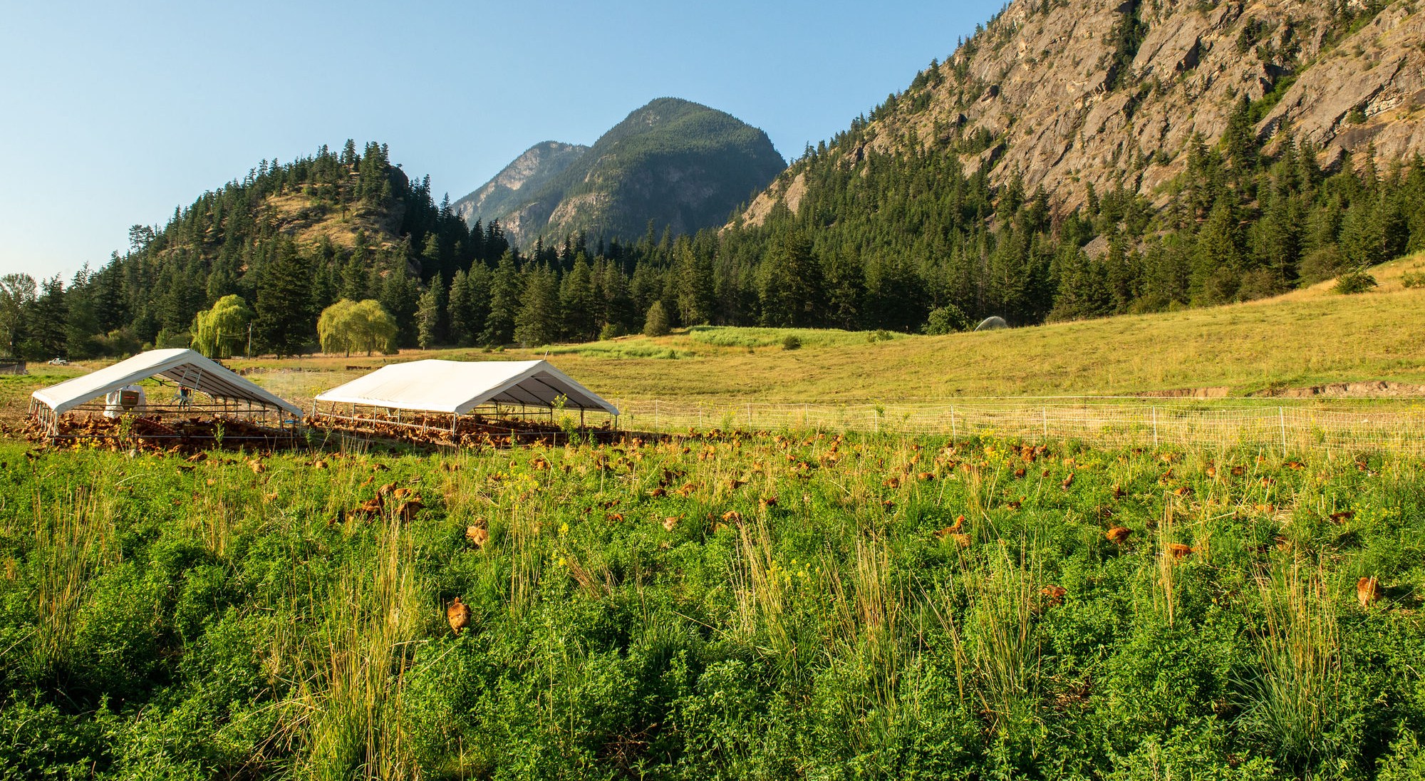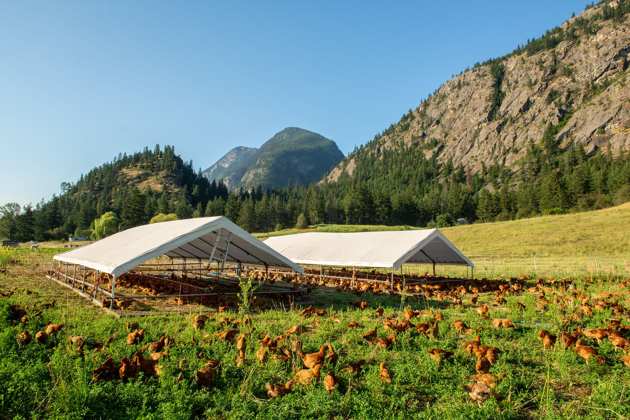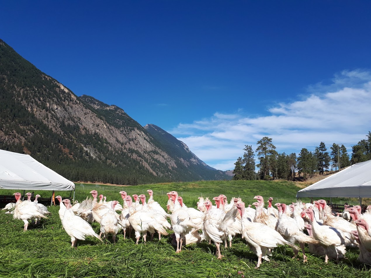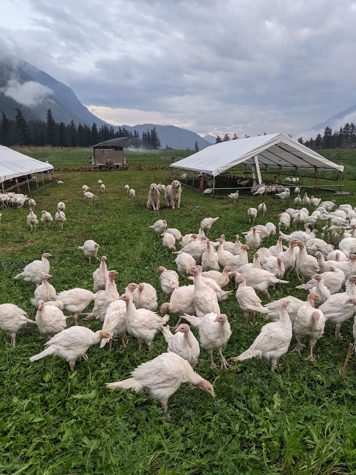 Our poultry housing and paddocks are moved across the pasture throughout the season so that the birds always have access to fresh forage and grubs, and their impact is evenly and beneficially spread across the farm. We supplement the birds’ foraging with certified organic, soy-and-corn-free feed we purchase from a trusted BC organic feed mill. All our poultry is slaughtered and packaged right here on the farm — hatch day to harvest day, we control every detail.