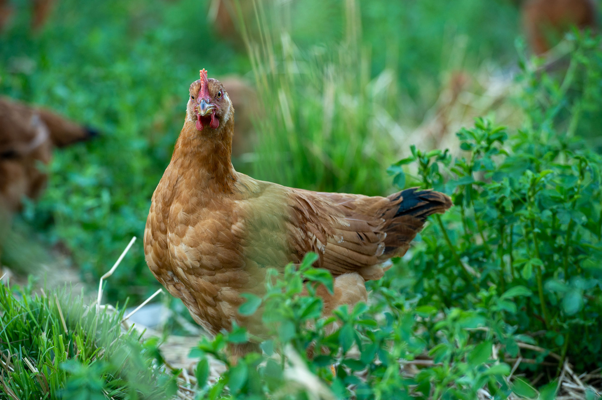 We raise slower-growing chicken breeds that are more active, better foragers, and are slaughtered at 8 to 12 weeks — almost twice as long as conventional (and even supermarket organic) birds. They are given fresh greens and soil in the brooder from the beginning, and moved onto pasture at three to four weeks. While on pasture they are truly free range and able to forage, run, play and rest outdoors 24 hours a day.