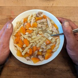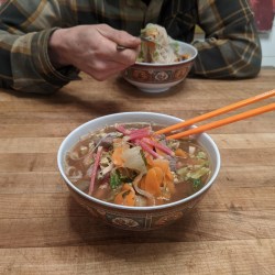 Although the weather has barely dropped below freezing, and we haven’t seen a flake of snow since last winter, I’d say it’s still solidly soup season – the best season for lazy chefs like me!  This time of year, when that ‘what’s for dinner?’ panic sets in, I just boil water for some noodles, melt some broth in a pot, throw some veg into the broth to cook, pull out some leftover meat from the fridge, and voila, dinner is ready!